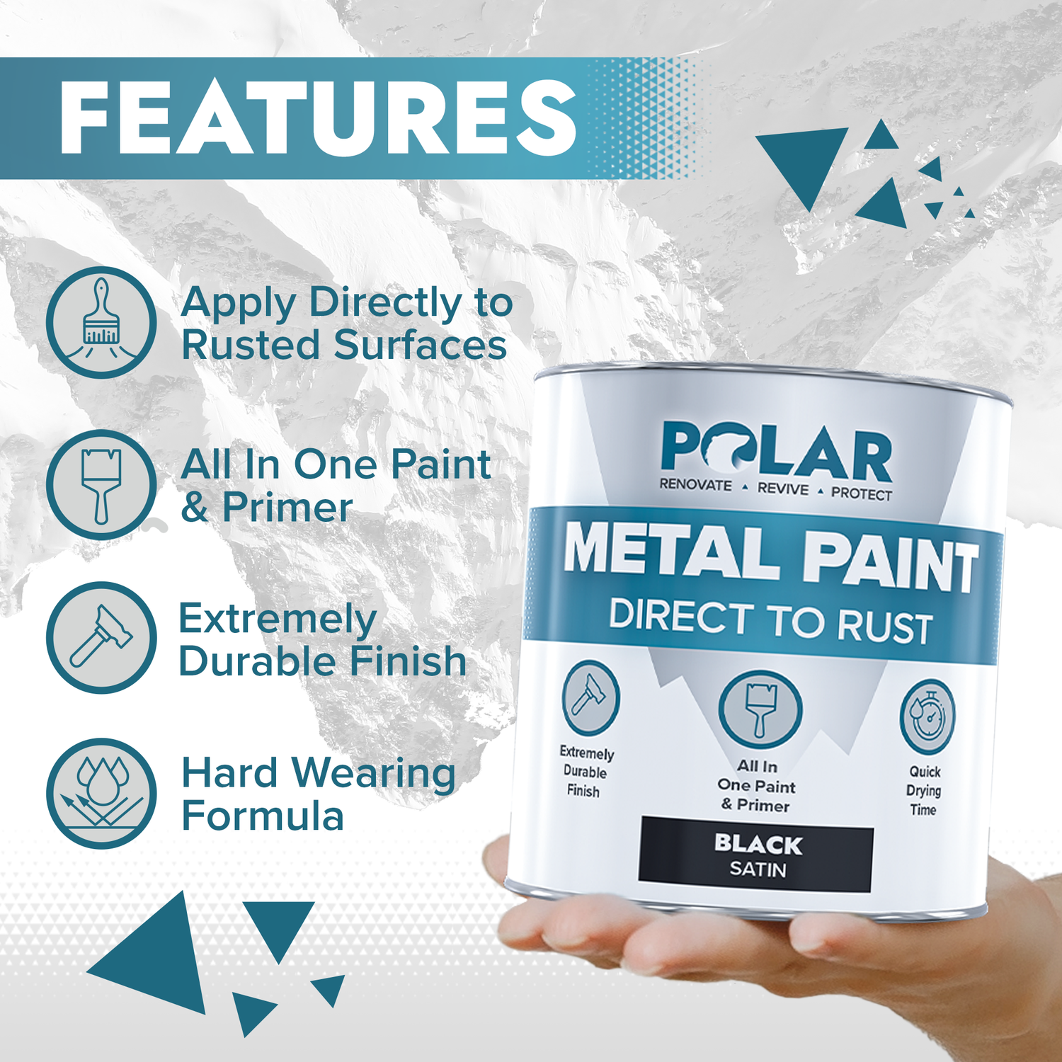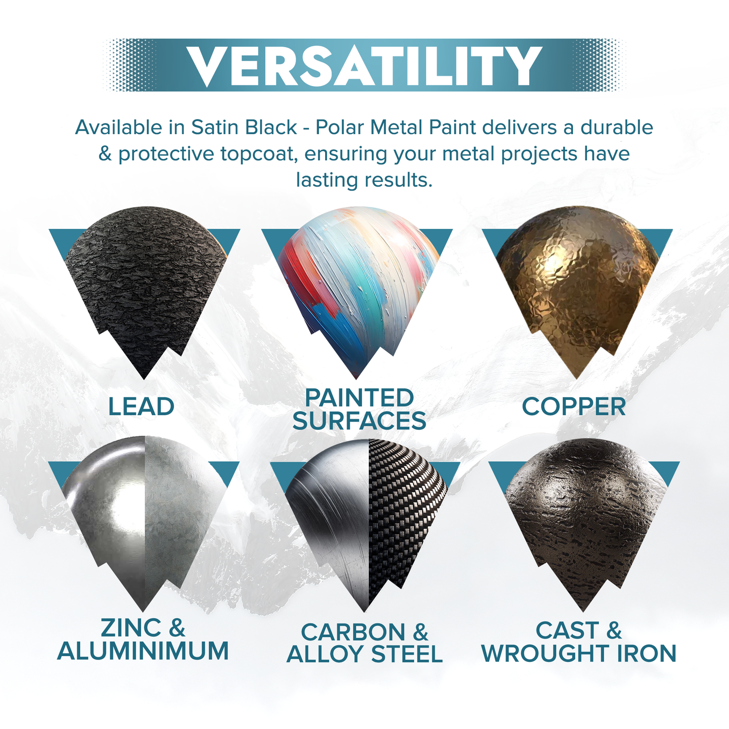 Attractive Finish: Polar Metal Direct to Rust Paint not only protects and restores rusty surfaces but also leaves an attractive satin finish. Available in Satin Black, this durable finish maintains its appearance over time and adds a fresh, modern look to any project, delivering professional results with minimal effort